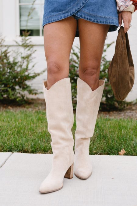 Details Microsuede bootsKnee highPointy toeBlock heel Fits true to size