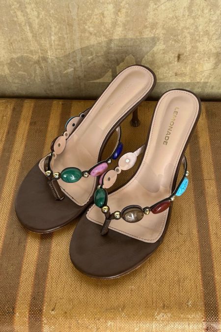 Details Brown heels with multi-colored gemstonesRound toeKitten heelThong toe strapFits true to sizeHeel measures 3 inches