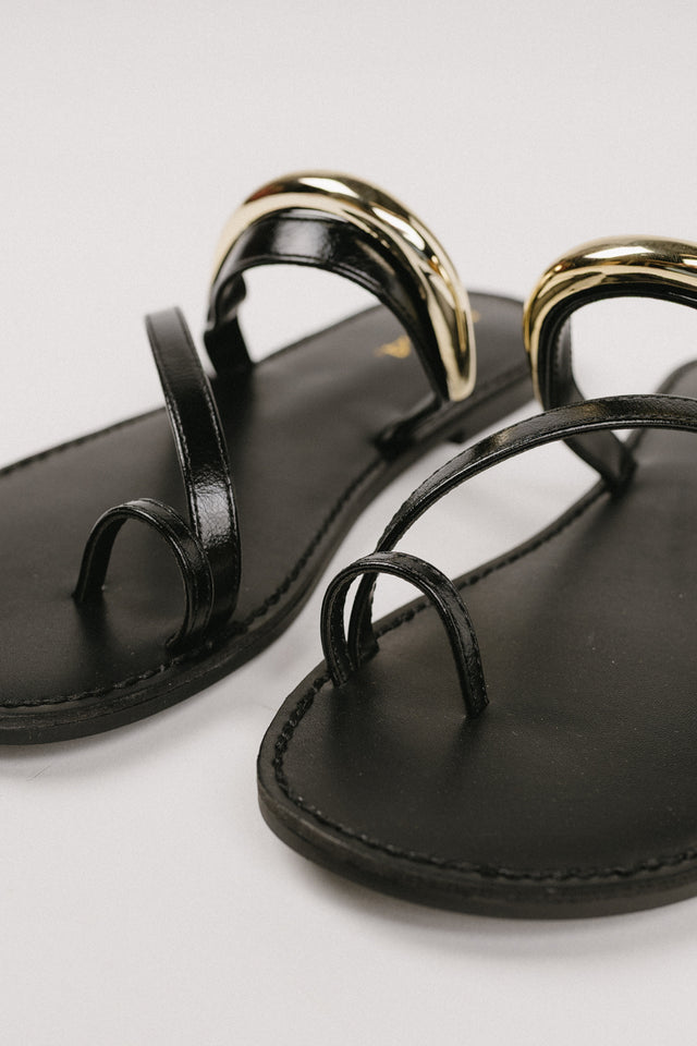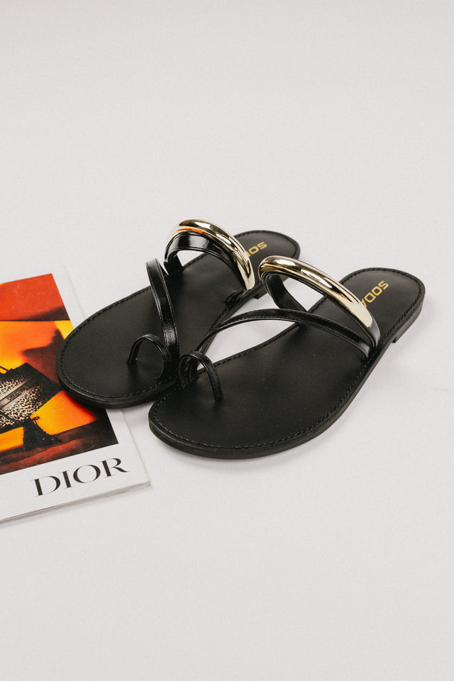 Black slip-on flat sandalsRound toe with toe ring strapInsole straps with silver bar accentFits true to size